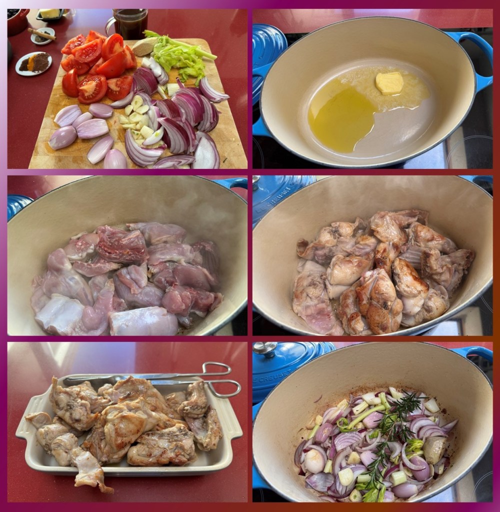 Salamos el conejo y ponemos a fundir la mantequilla con el aceite para que no se nos queme, doramos el conejo y lo retiramos a una bandeja, rectificamos aceite si hiciese falta y rehogamos las chalotas, ajo, cebolla, jengibre y apio, añadimos la rama de romero y las especias en semilla para tostarlas (pimienta, clavo, comino y canela), integramos un par de minutos.