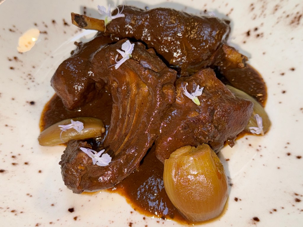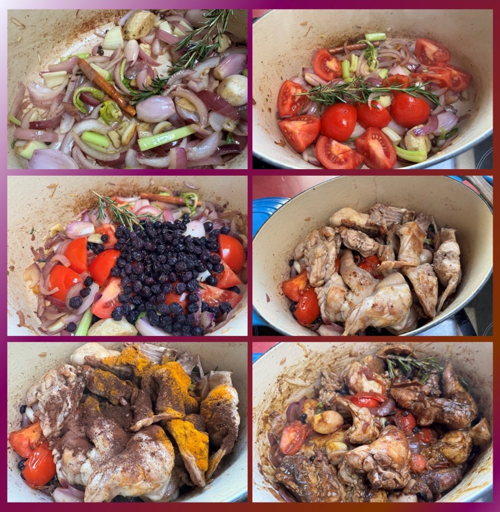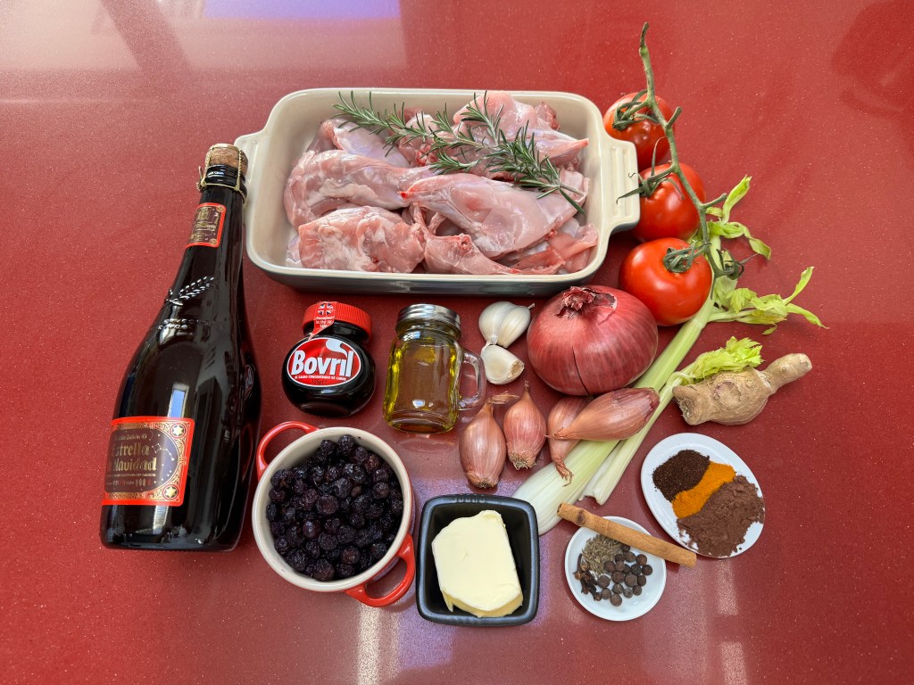1 conejo (1,5kg), 1 cebolla morada, 3 tomates rama, 2 ramas de apio, 3 dientes de ajo, chalotas, 1 trozo de jengibre fresco, 70cl cerveza navideña o tipo abadía, 250 ml de caldo de carne (1cda de Bovril + agua caliente), 150grs de arándanos, 50grs de mantequilla, 25grs de AOVE, 1 cuchara de postre de cacao puro, cúrcuma y chile chipotle, 10 bolitas de pimienta de Jamaica, 5 clavos de olor, semillas de comino, 1 rama de canela, rama de romero fresco y sal.