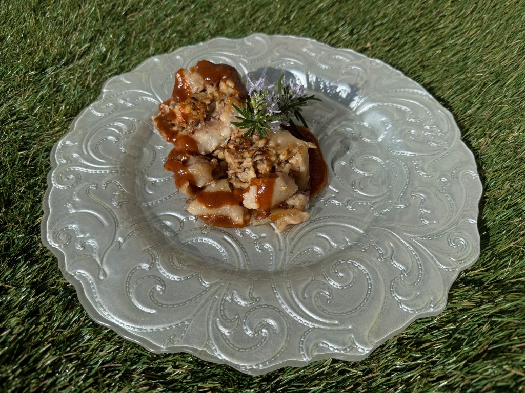 Añadimos la pasta de chile y las hierbas, desglasamos con el agua de manitas que nos habíamos reservado, e incorporamos el tomate y el chile en polvo. Rehogamos y tapamos durante unos tres minutos para que el tomate sude, luego le añadimos medio litro de agua y dejamos cocer durante 15 minutos.
