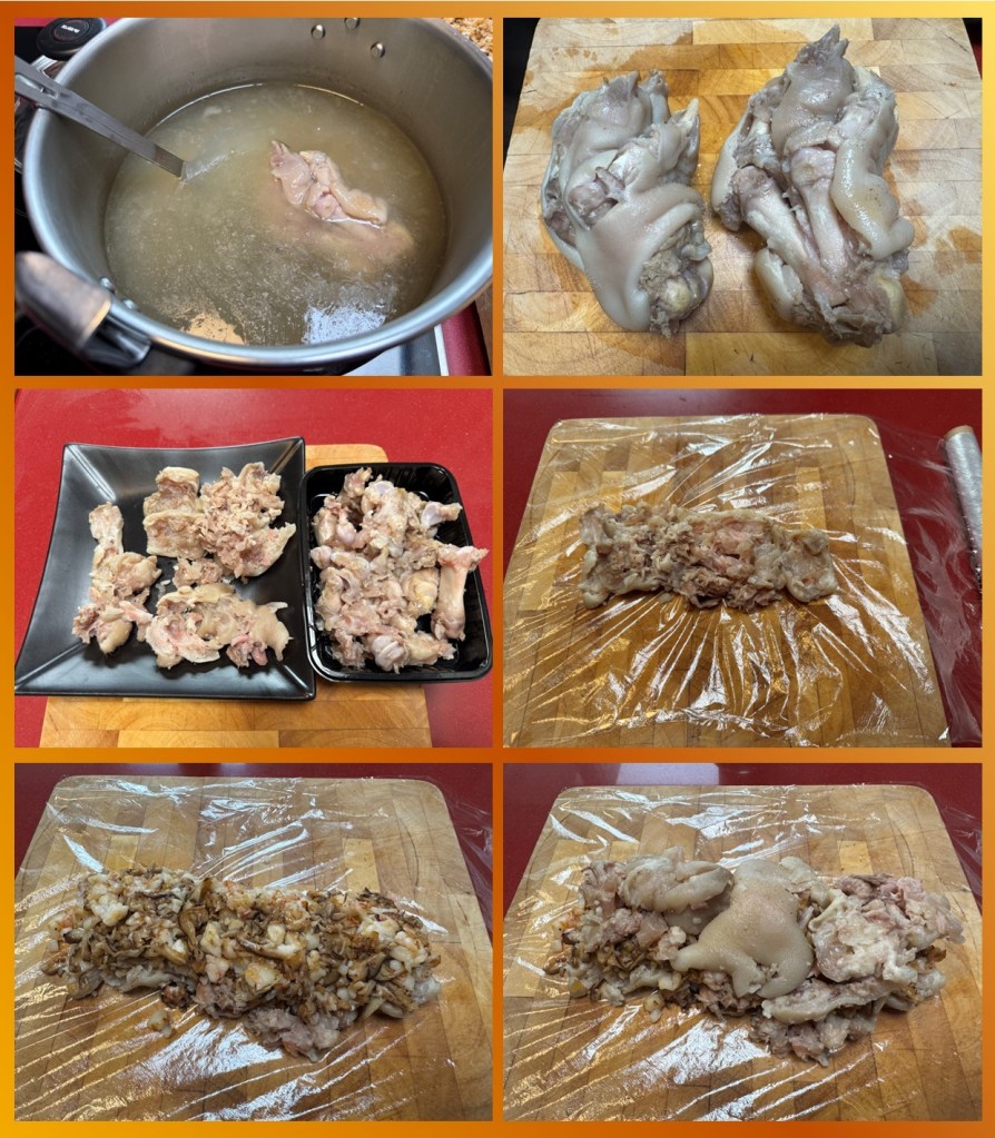Una vez que se enfríen un poco y podamos manipular sin quemarnos mucho, intentaremos sacarle todos los huesos, pezuña y tendones sin que se nos desmonte mucho la estructura. Una vez las tenemos deshuesadas, estiramos un papel film y colocamos parte en la base, ponemos por encima abundante relleno y cubrimos con el resto de las manitas. Ahora con cuidado enrollamos envolviendo como si fuese un caramelo y ayudándonos de los laterales de film sobrante hacemos correr el rulo por la encimera para que se nos compacte. Refrigeramos durante un día.