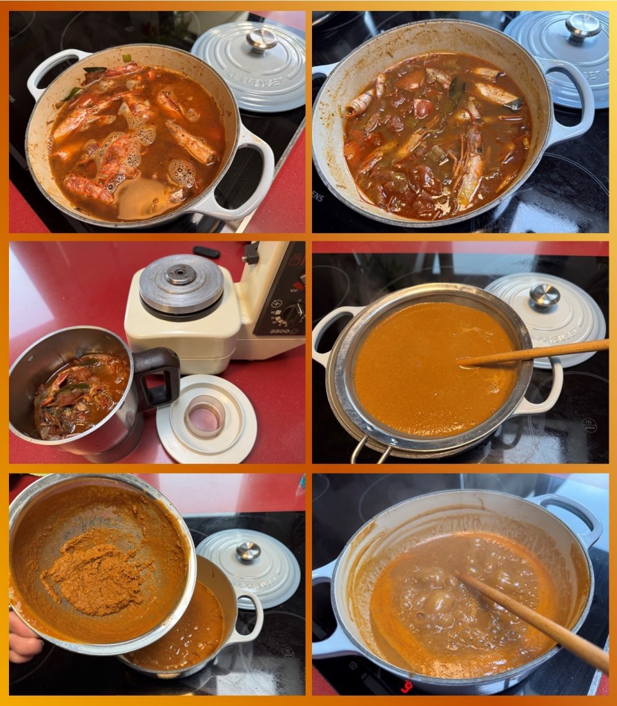 Reconozco que soy puntilloso y aunque la salsa esta de muerte, al triturar con las cabezas. pese a colarlo fino, la textura no es la que buscaba. Volví a colar pero simplemente por decantación, sin remover con la cuchara, esto nos deja un jugo que he vuelto a reducir y que era el resultado buscado.