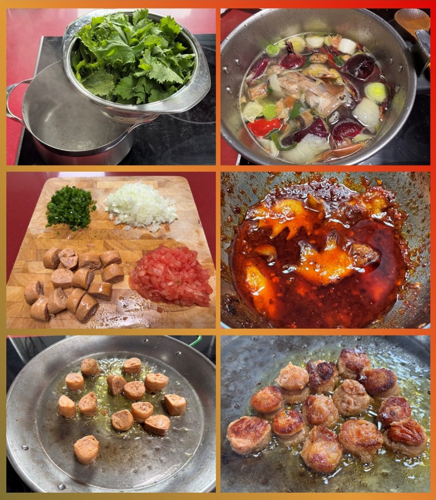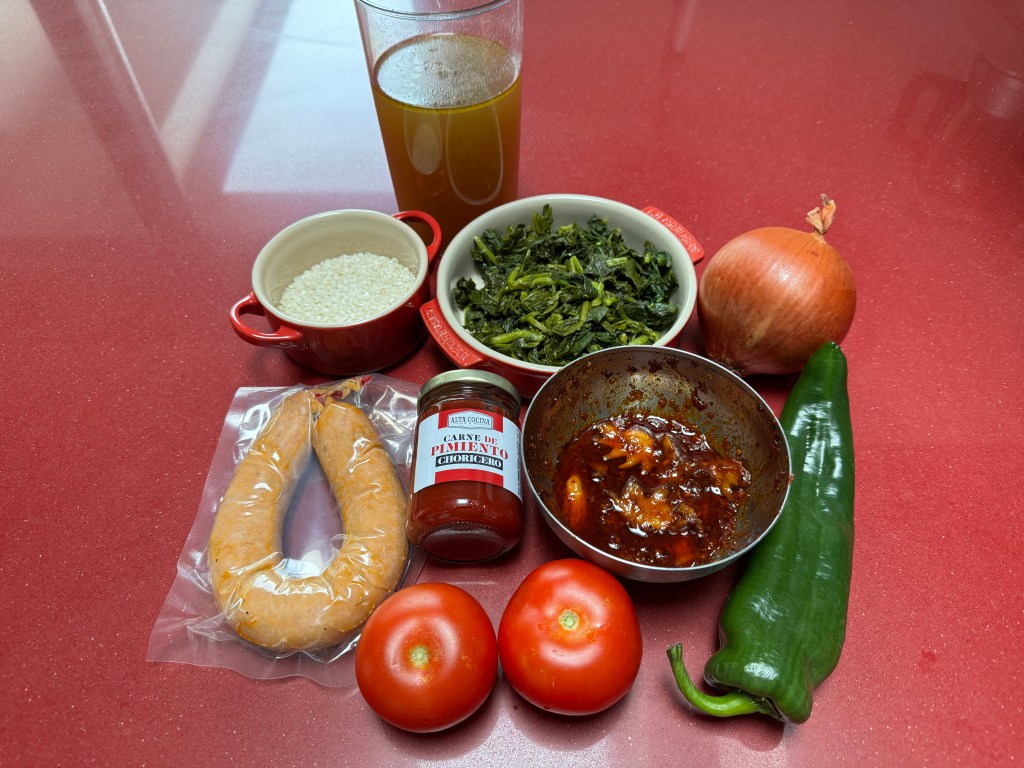 1 manojo de grelos, 1 alheira de Mirandela, crestas de gallo, 100grs de arroz, 1/2 cebolla, 1/2 pimiento verde italiano, 2 tomates rama, 1cda de pimiento choricero, 1L de caldo de pollo, agua, pimienta, sal y AOVE.
